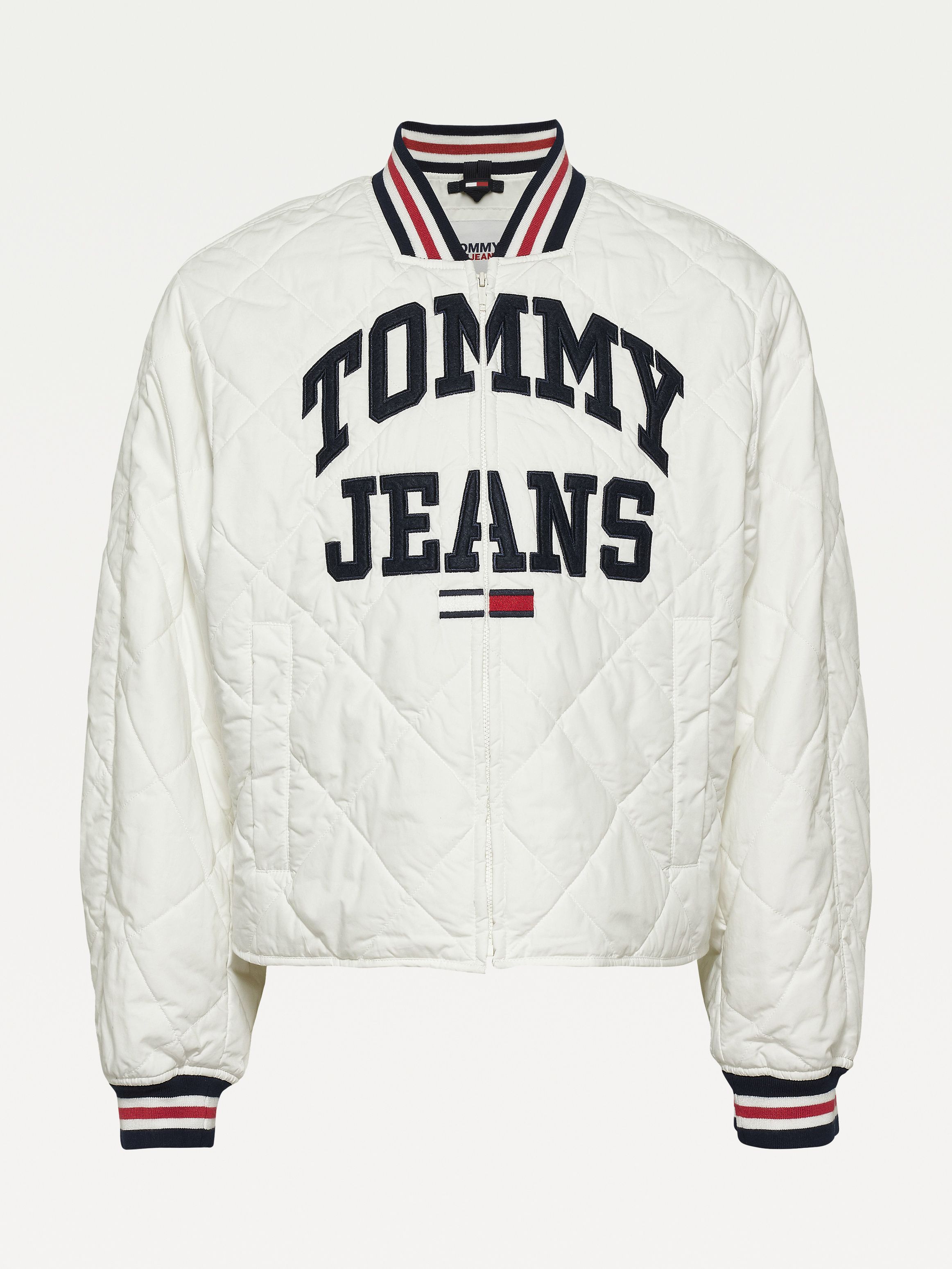 • قطن خالص • خياطة ماسية الشكل • مبطن بحشو - بولي فيل • ياقة بيسبول • يغلق بسحاب • أساور منسوجة • مبطن • جيبان بسحاب على الخصر • شعار تومي جينز على الصدر • علامة تومي جينز التجارية
