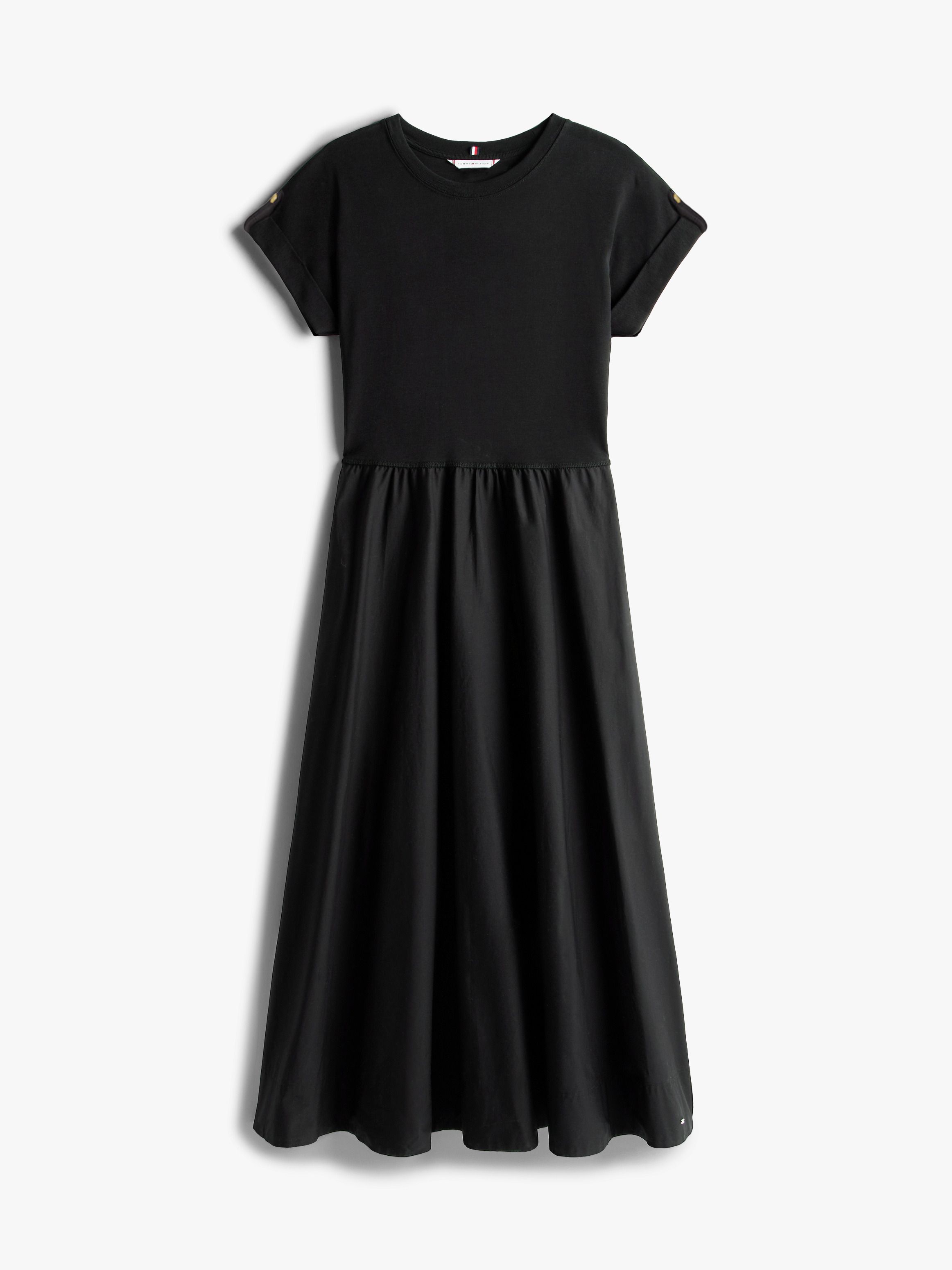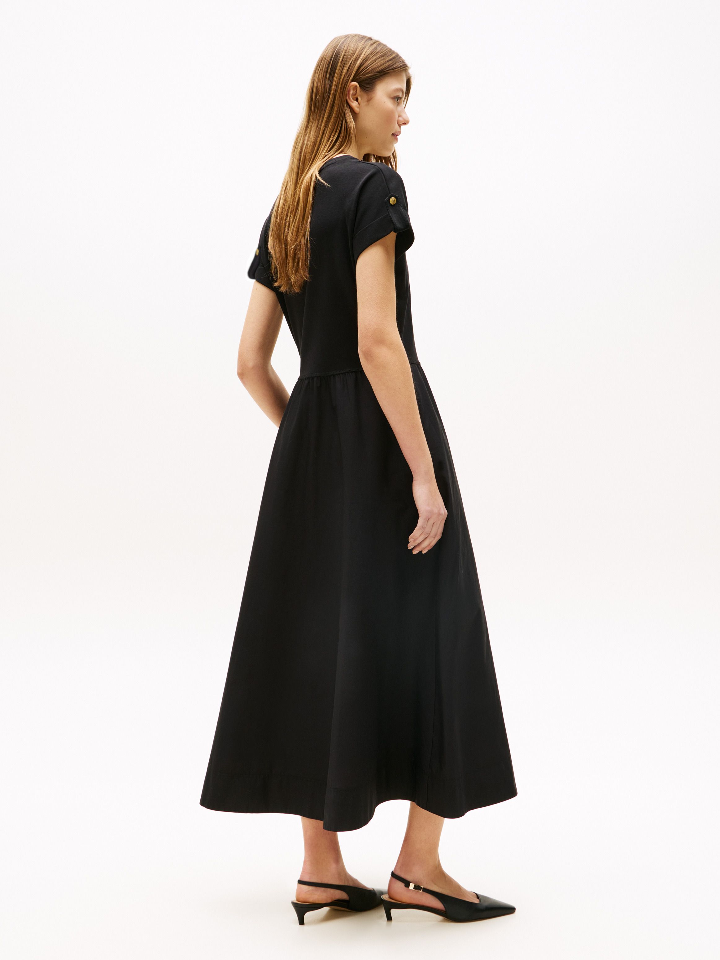 التفاصيل اختاري لمظهر أنيق وغير متكلّف هذا الفستان الميدي بتصميمه المريح وأزراره الذهبية اللامعة على أطراف الأكمام. إنه خيار مثالي للتجوّل في المدينة بأسلوب عصري يبرز الذوق الرفيع. أبرز التفاصيل • قطن مطاطي يمنحك الراحة • ياقة دائرية كلاسيكية • أكمام قصيرة بتصميم مطوي للخارج • أزرار بلون ذهبي محفور عليها شعار TH • شريط توقيع العلامة داخل الياقة • تطريز علم Tommy Hilfiger على الحاشية • شعار العلامة على التصميم القصة والمقاس • قصّة مريحة وانسيابية • تنورة متّسعة بقصّة Fit and Flare • طول ميدي (133 سم من الكتف إلى الحاشية حسب المقاس S) • الموديل بطول 1.76 م وترتدي المقاس S الخامة والعناية • 97% قطن، 3% إيلاستان