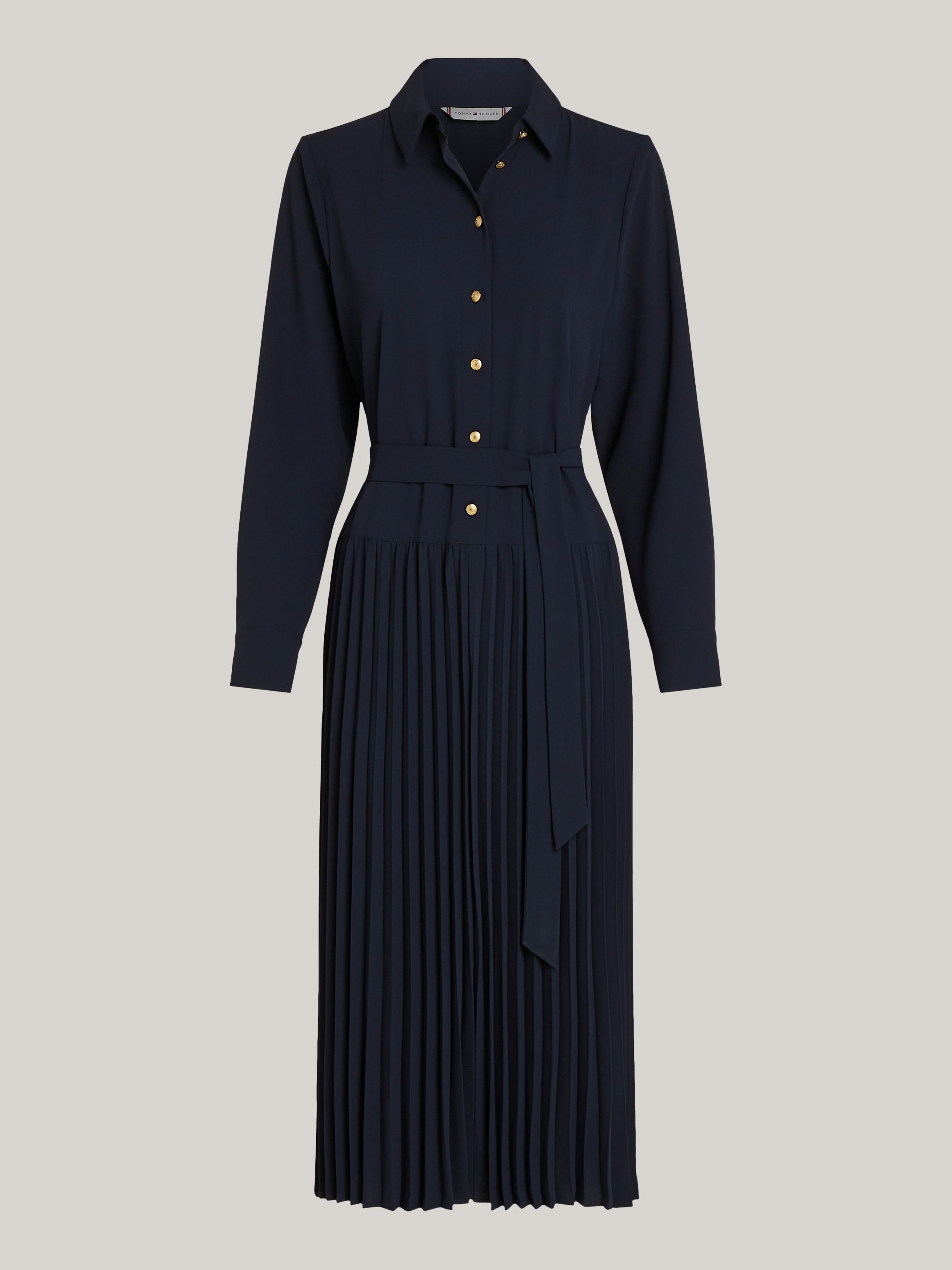 يجمع هذا الفستان بين القصة المريحة والخصر المنخفض والطيّات الواضحة، مما يجعله مثاليًا للمناسبات الرسمية.