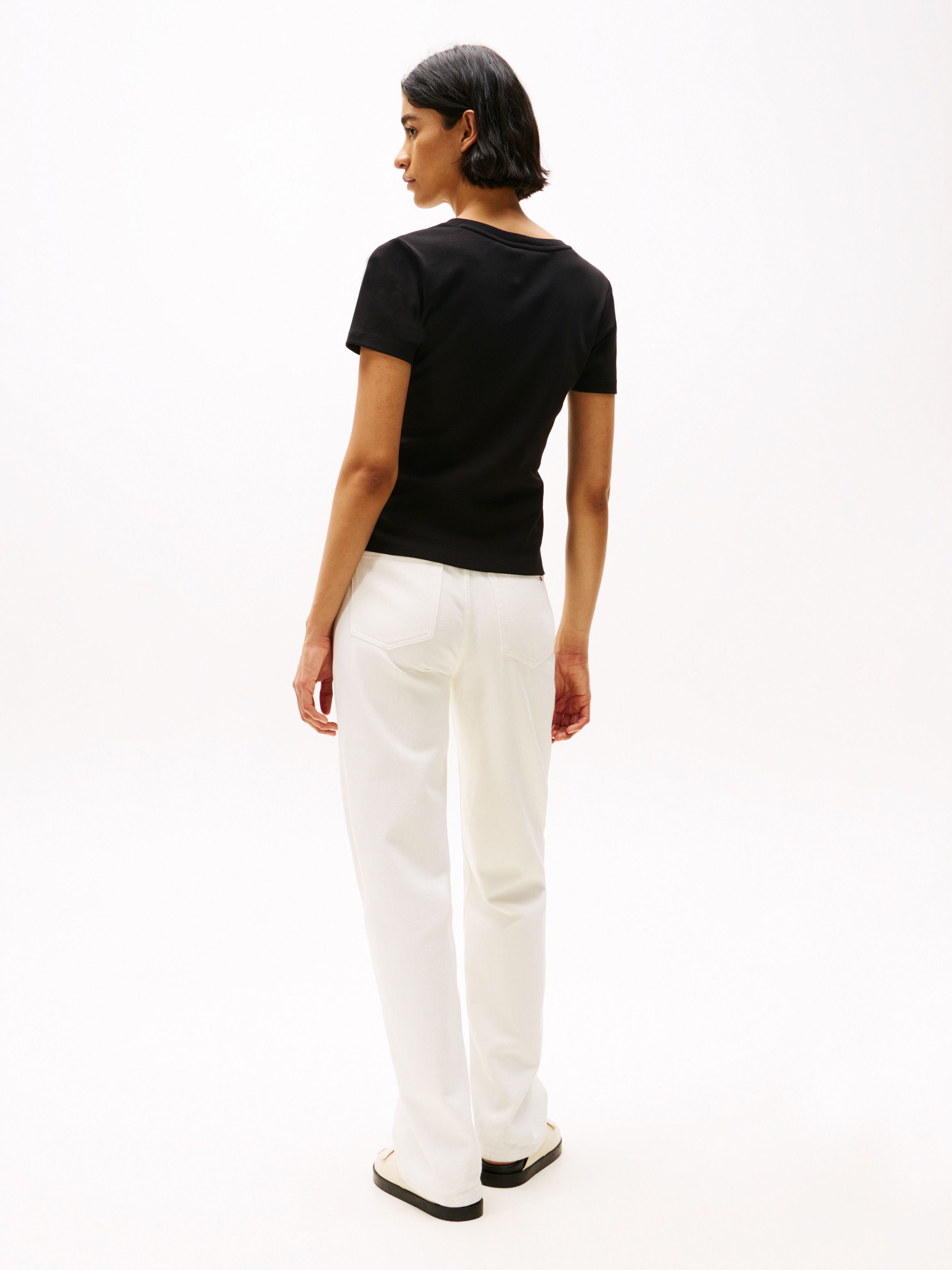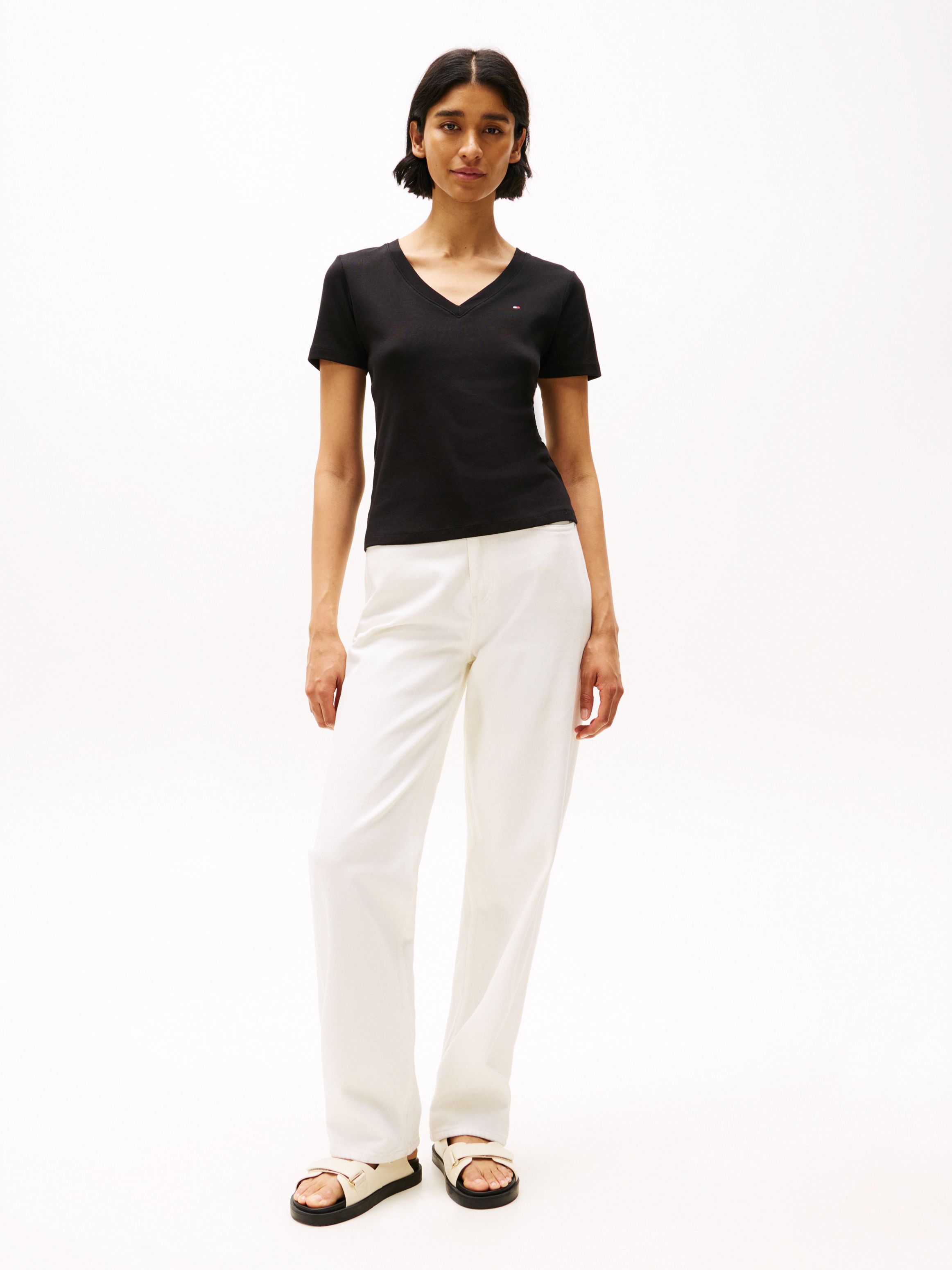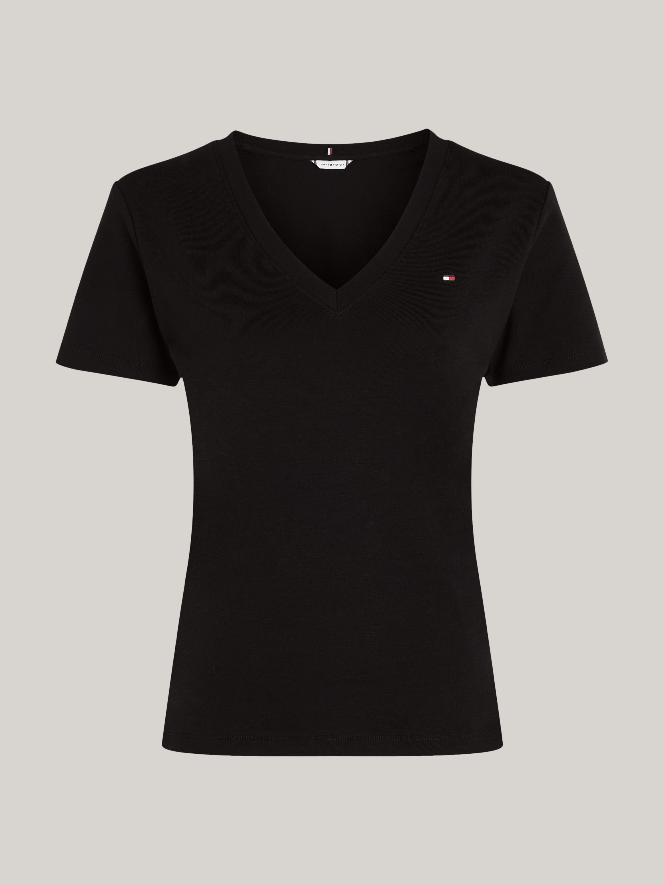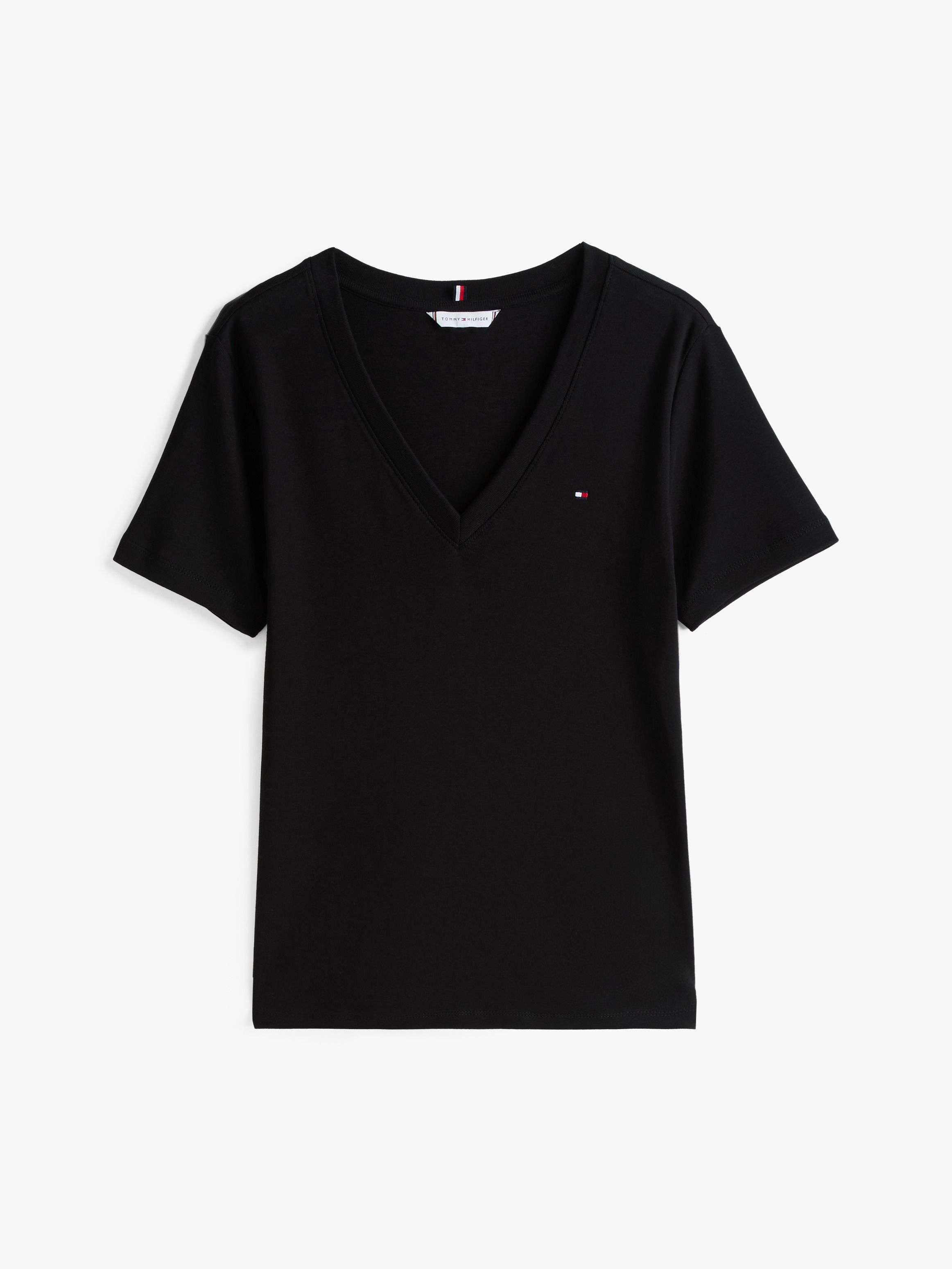 تيشيرت بقصة ضيقة وياقة V من تومي هيلفيغر، يتميز بقصة ضيقة تناسب الجسم مع ياقة V التي تضفي لمسة أنيقة، مما يساعد على إظهار شكل الجسم بطريقة جذابة. القطن الخالص يضمن لك شعورًا بالراحة والانتعاش طوال اليوم.
