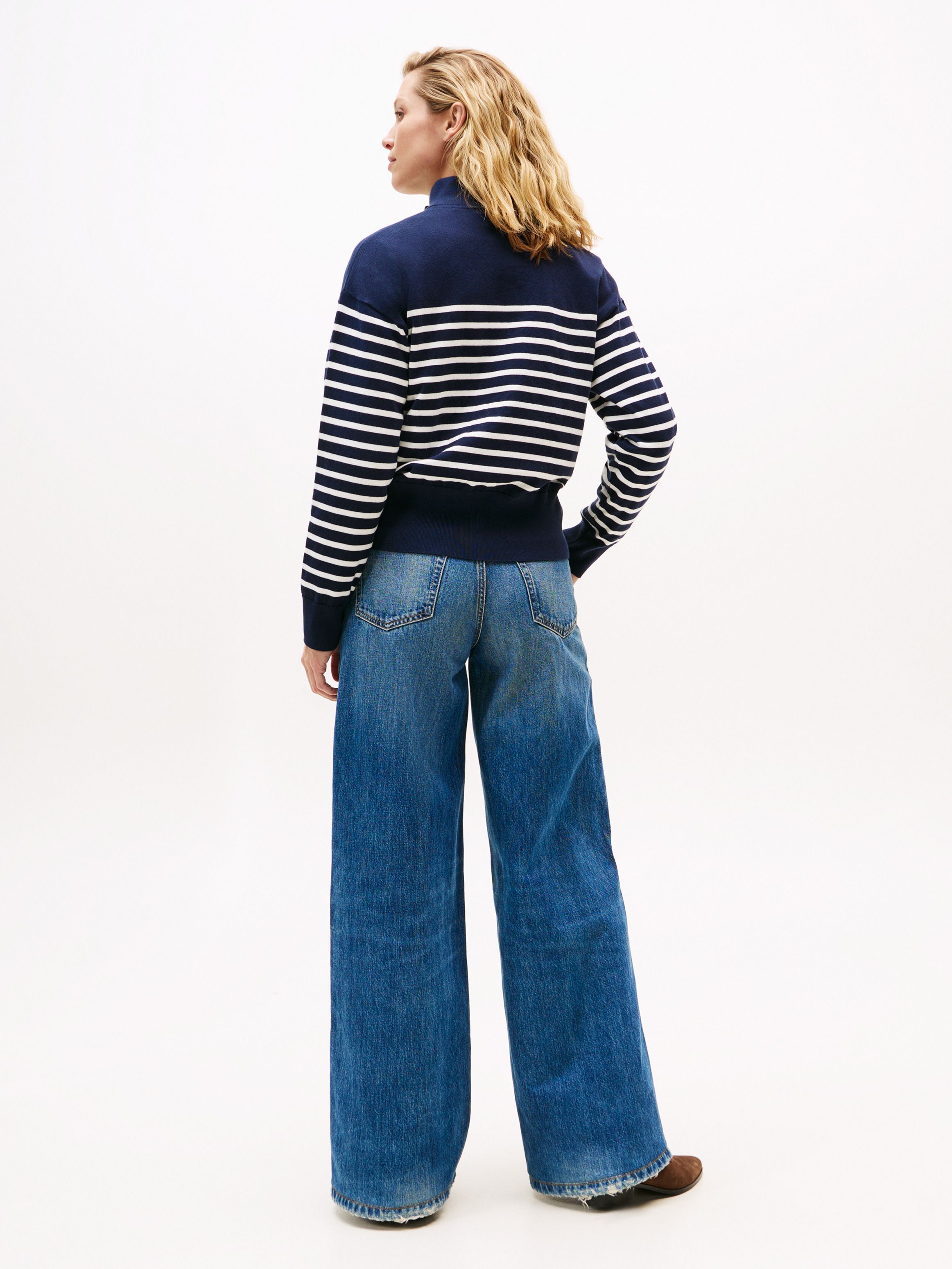 يتميز هذا البلوفر المخطط برقبة عالية مريحة تُغلق بأزرار باللون الذهبي، ما يضفي لمسة فاخرة على قطعة كلاسيكية في خزانة الملابس. أبرز الميزات • قماش جيرسي ناعم من القطن الخالص • نسج متوسط السماكة • تصميم بخطوط أفقية • ياقة مرتفعة (Mock neck) • فتحة بأربعة أزرار بلون ذهبي • شريط توقيع العلامة داخل الياقة • شعار Tommy Hilfiger • شعار العلم المحفور على الأزرار • علم معدني لتومي هيلفيغر على الكم الشكل والمقاس • قصة عادية (Regular fit) • أكتاف منخفضة (Dropped shoulders) • العارضة بطول 1.76م وتلبس مقاس S الخامة والعناية • 100% قطن