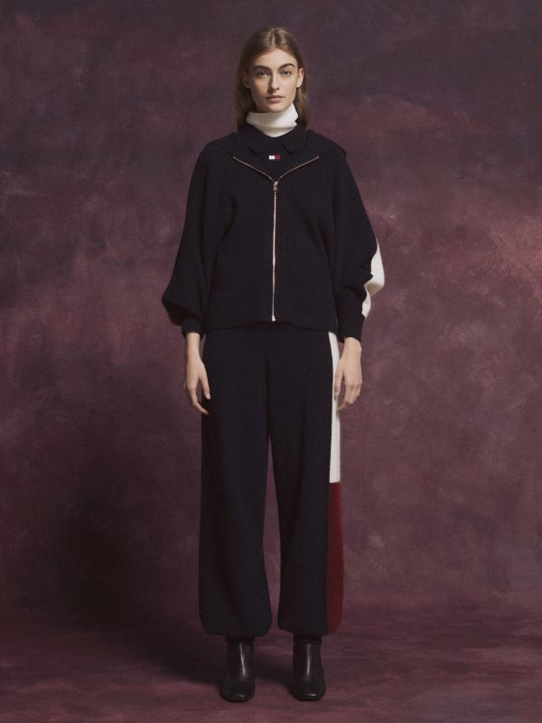 • مزيج صوف الألبكة • تصميم التوقيع بألوان متناسقة على الظهر • ياقة بغطاء رأس • سحاب • أساور وحافة مفصلة • العلامة التجارية لمجموعة تومي هيلفيغر